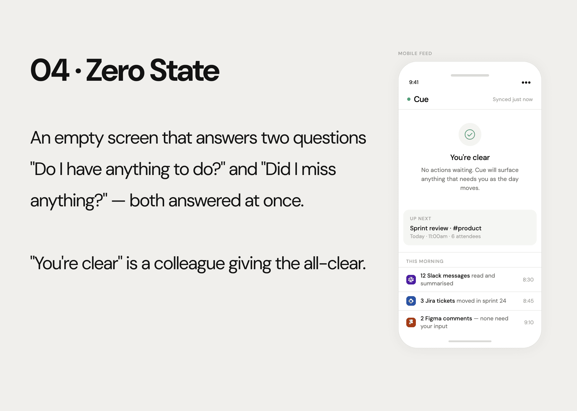 Cue’s zero state addresses this directly. “You’re clear” answers the action question. The morning digest (“12 Slack messages summarised”, “2 Figma comments — none need your input”) answers the anxiety question. Both are necessary.