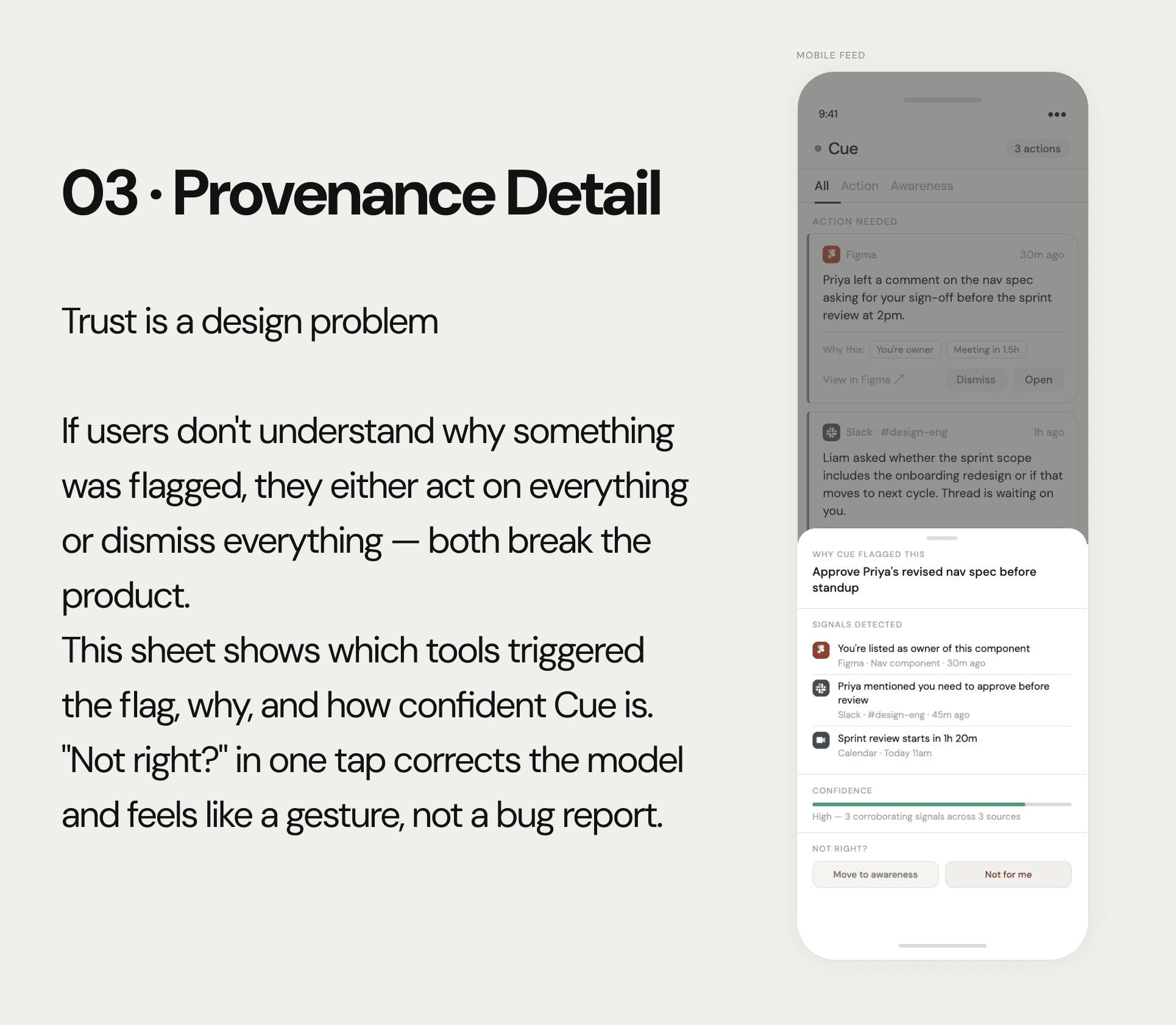 Every action item surfaces its reasoning: which signals Cue detected, from which sources, and a confidence indicator. This was a direct response to the trust problem. If a user doesn’t understand why something was flagged as an action, they either act on everything (defeating the purpose) or dismiss everything (same result).