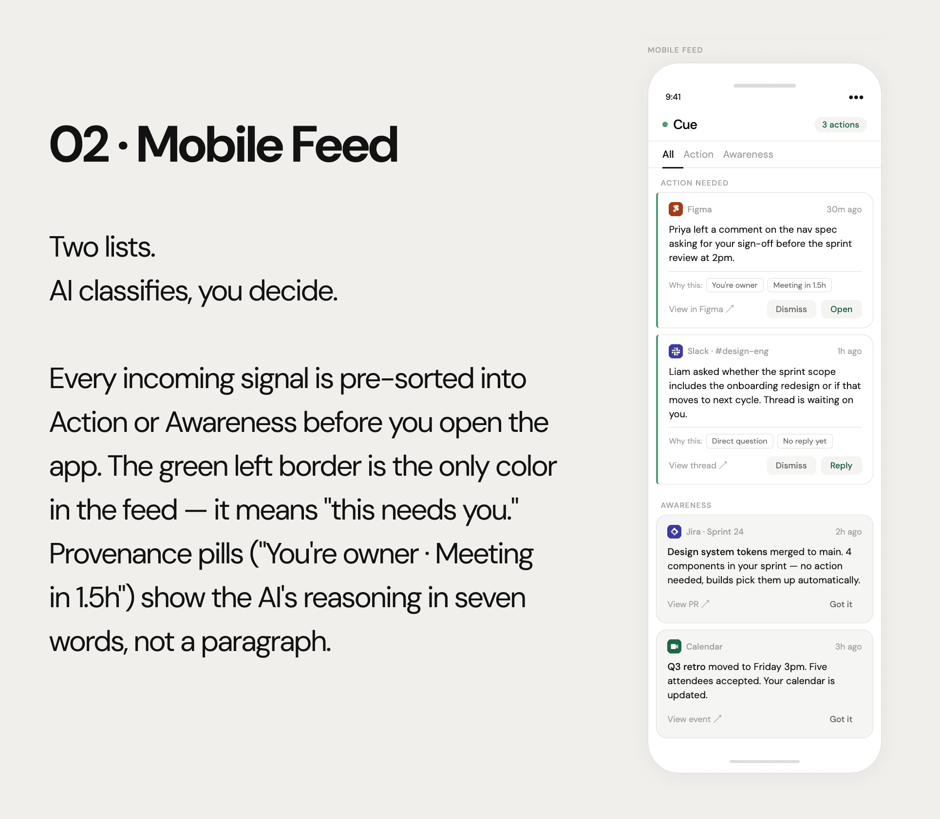 We landed on two named lists: Action (requires your input) and Awareness (things that happened that you should know). Everything incoming gets assigned to one of these. The user’s first interaction with Cue is not “let me sort through this” but “what do I need to do?”