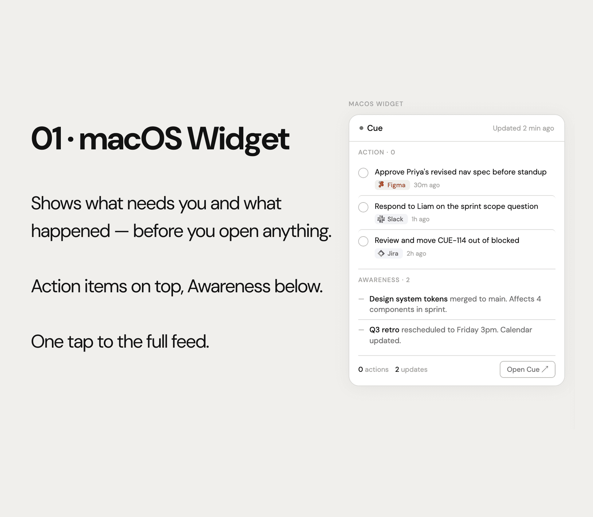 Cue is designed to solve this. It aggregates signals from Slack, Jira, Figma, and calendar events, processes them with AI, and surfaces them as two lists: what to know, and what to do. The goal is to give users their first 30 seconds of clarity before the workday begins.